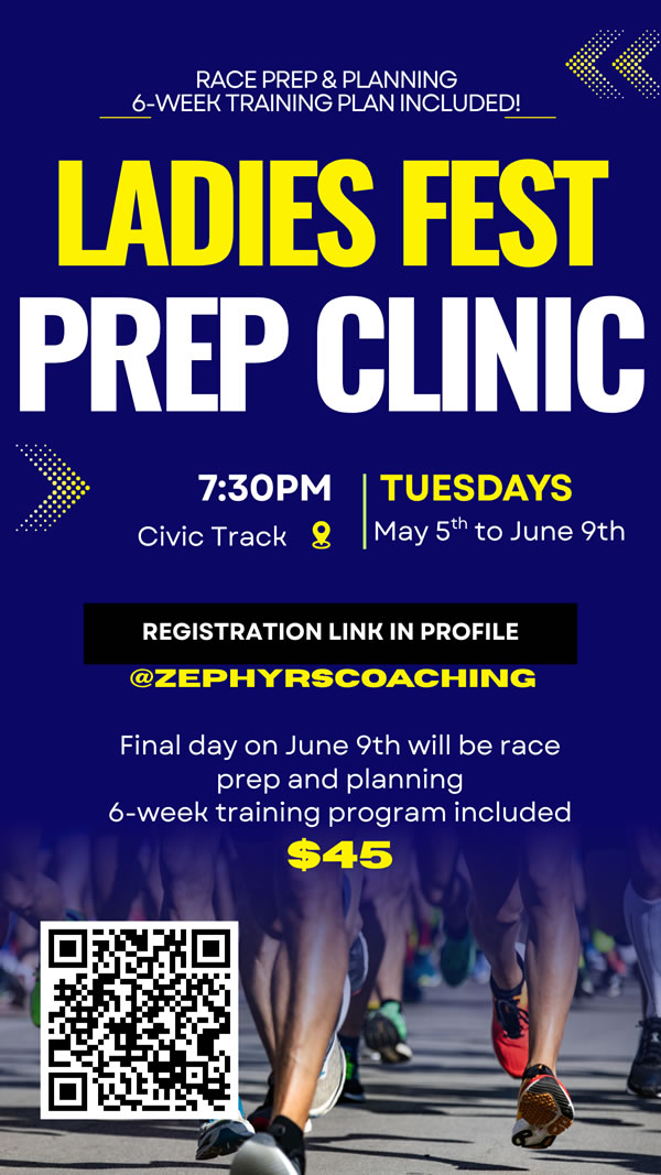 Zephyrs Coaching is offering a 6 week clinic to help prepare you for this year’s race! The 6 week program starts on May 5 to June 9 at the Civic centre track. Cost is $45 (registration link)